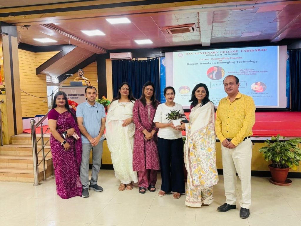 फरीदाबाद (विनोद वैष्णव) : फरीदाबाद के डी.ए.वी. शताब्दी कॉलेज में बीसीए विभाग द्वारा कैरियर काउंसलिंग सेशन का आयोजन किया गया, जिसका विषय था “उभरती हुई तकनीकों में नवीनतम रुझान”। इस कार्यक्रम में मुख्य वक्ता के रूप में मिस नवीना उपस्थित थीं, जो फुजित्सु कंसल्टिंग इंडिया में सीनियर सॉल्यूशन आर्किटेक्ट है और कॉलेज में बीसीए की पूर्व छात्रा भी रही हैं।नवीना का स्वागत कॉलेज की कार्यकारी प्राचार्य डॉ अंजू गुप्ता के साथ एसोसिएट प्रोफेसर डॉ रुचि अरोड़ा ने किया।