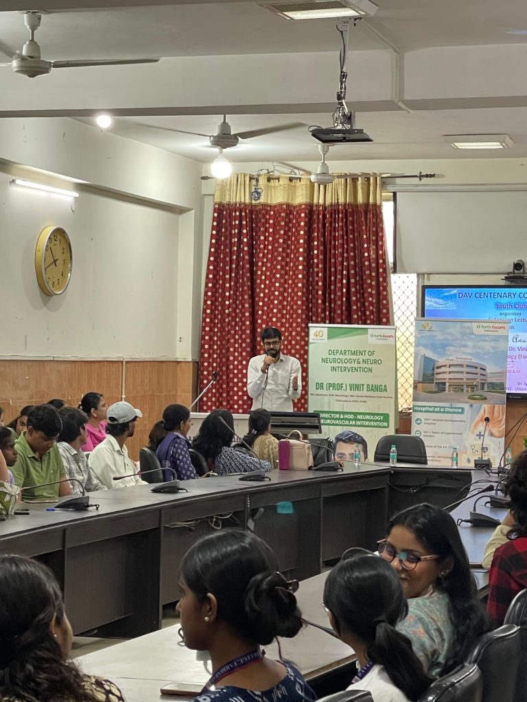 फरीदाबाद (पिंकी जोशी) : डी.ए.वी. शताब्दी महाविद्यालय के यूथ क्लब द्वारा “स्ट्रोक अवेयरनेस” पर विस्तार व्याख्यान का आयोजन किया गया। इस कार्यक्रम के वक्ता डॉ. विनीत बांगा, निदेशक एवं विभागाध्यक्ष – न्यूरोलॉजी, फोर्टिस हॉस्पिटल, फरीदाबाद थे। यह आयोजन डॉ. नरेंद्र कुमार, कार्यकारी प्राचार्य, डी.ए.वी. शताब्दी महाविद्यालय के कुशल मार्गदर्शन में हुआ। इस कार्यक्रम का उद्देश्य छात्रों और संकाय सदस्यों में स्वास्थ्य जागरूकता बढ़ाना और निवारक स्वास्थ्य देखभाल प्रथाओं को बढ़ावा देना था।